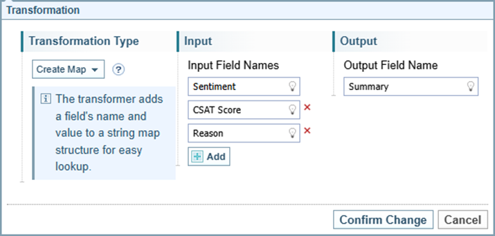 The Create Map transformer adds field names and values to a map data structure (key: field name, value: field value) for easy lookup and outputs to the defined field with the ‘string_map’ datatype. The input values are transformed into the ‘string’ datatype and stored in the map.