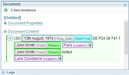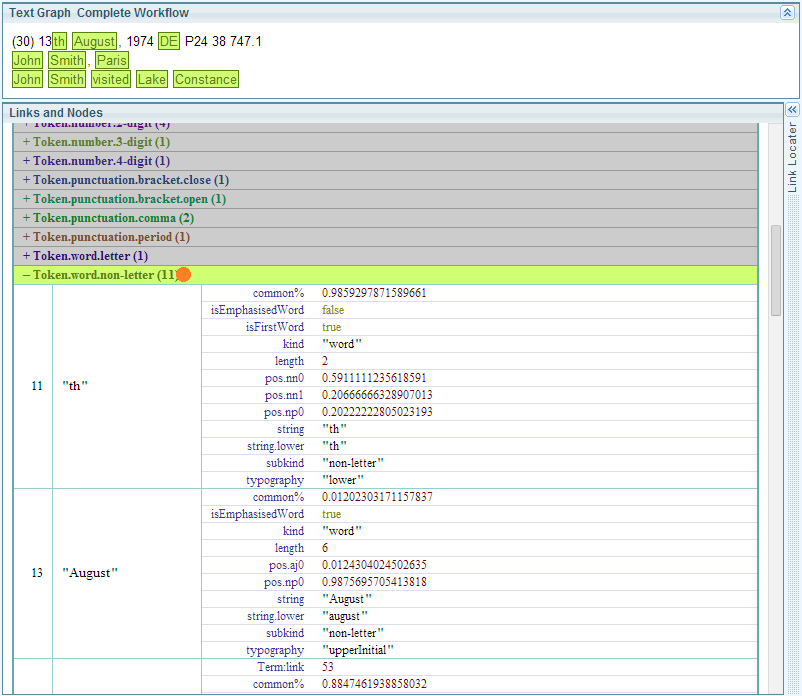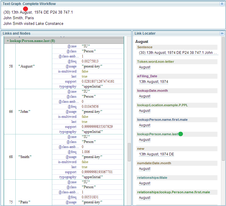 In the text graph pane, if you are interested in a particular text token, for example, "August" below, click it to reveal the Link Locator pane, which lists all the links overlapping the token.
