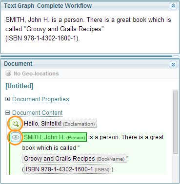 Clicking a looking glass icon next to a text block runs the text graph analyser on that text block. The icon then becomes the eye icon to indicate which text block is currently being analysed.