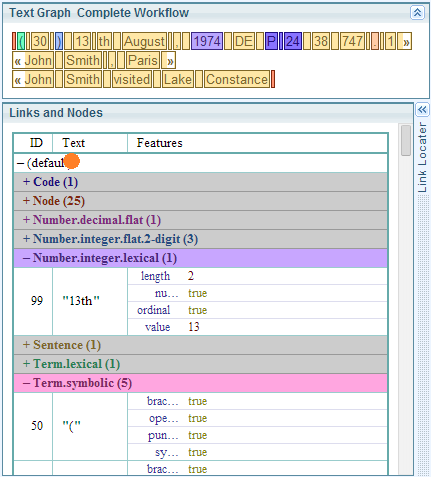 Below the text graph pane is the Links and Nodes pane. This lists all the nodes and links on the text graph, together with their features, and the label (if available) of the rule that created them.