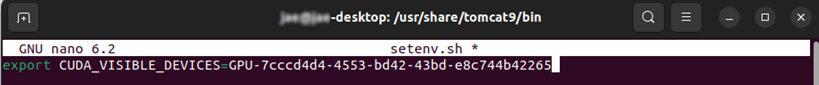 Copy the UUID of the CUDA device you want to use. For example: GPU-7cccd4d4-4553-bd42-43bd-e8c744b42265.