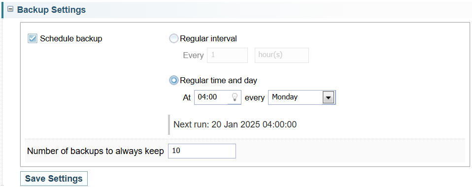 Backup Settings - you can view the backup schedule and Schedule backups.