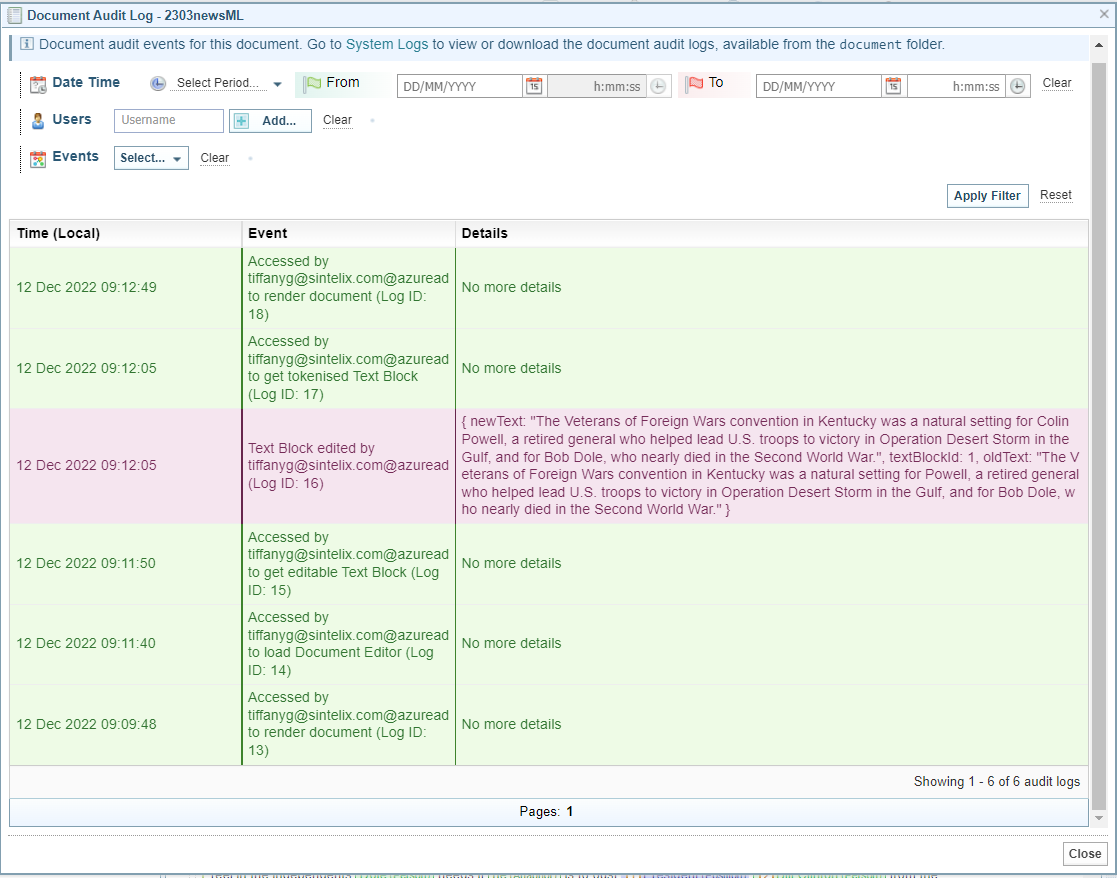 You can filter the Document Audit Log by Date Time, Users, or Events.