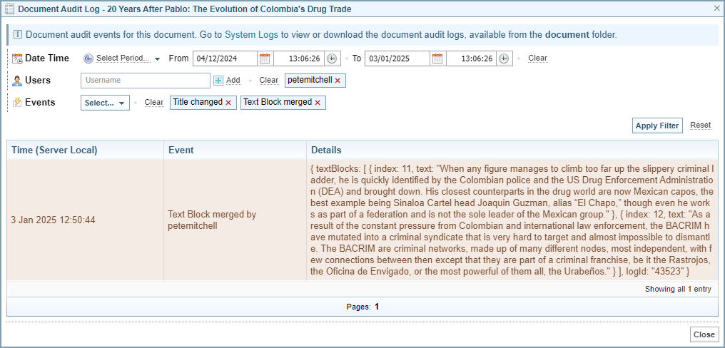 The Document Audit Log Dialog also allows you to filter the log entries. See Filter the Document Audit Log.