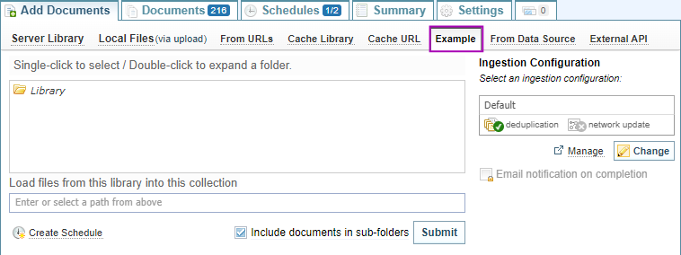 For example, this XML instruction creates a new FileSystem library and adds an Example tab on the Add Documents panel.