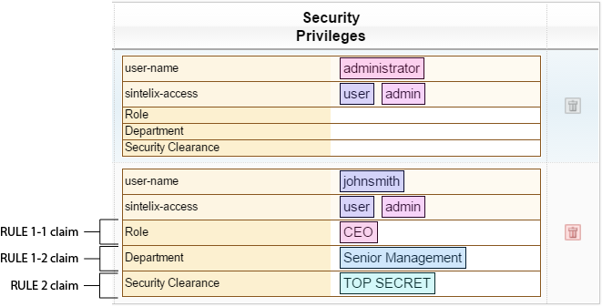 Grants access if a value from the specified security privileges property field matches a value from the specified security metadata property field. |