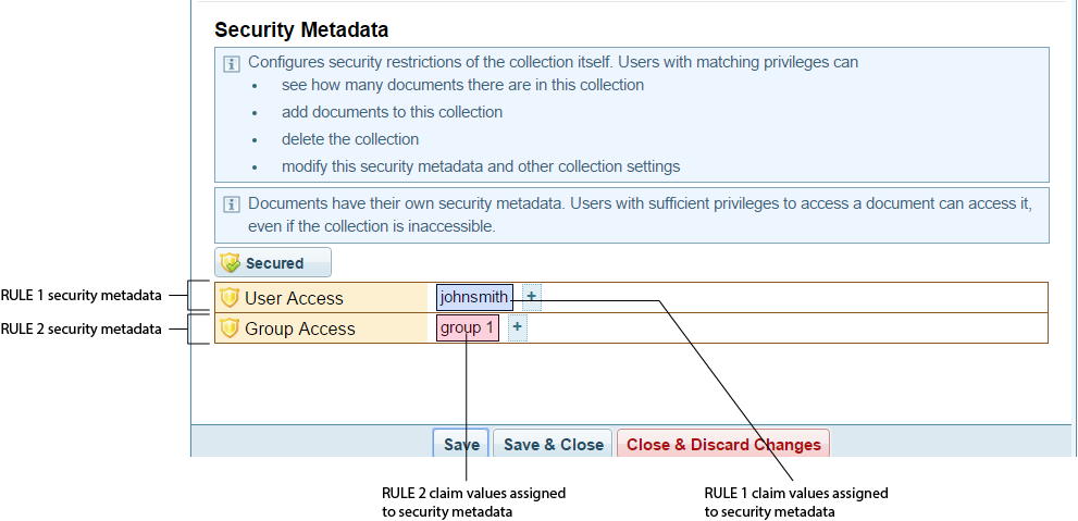 Security Metadata : Security metadata is automatically entered when the user johnsmith creates a new Collection. Collections > Collection > Collection Configuration > Security Metadata pane |