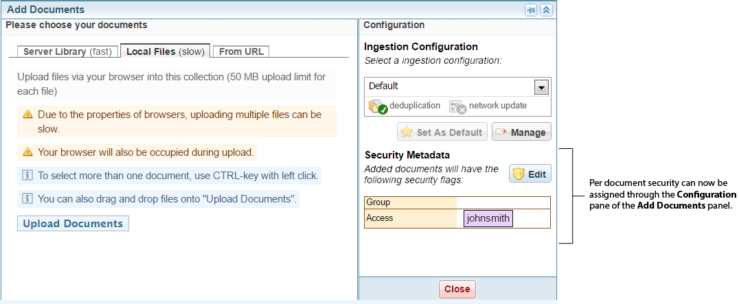 When set to In the Add Documents panel in the Configuration pane, Security Metadata configuration is visible. You can apply document security to individual documents, in addition to the security of the Collection they belong to. |