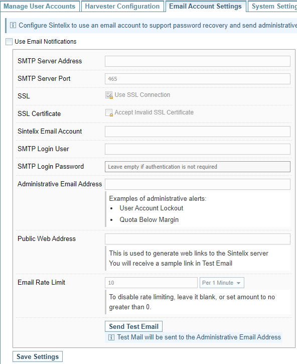 - SMTP Server Address is the server Sintelix will use to send email.