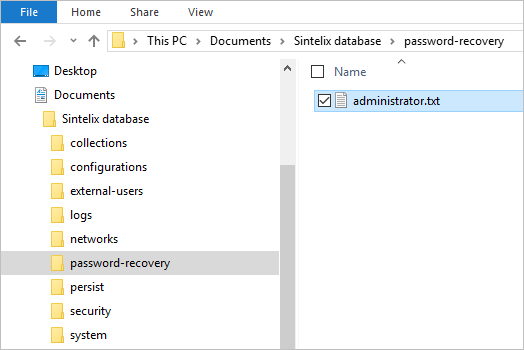 Go to the directory <Sintelix database directory> The directory in which the Sintelix database is stored, for example, C:\Users\Documents\Sintelix database.\password-recovery.