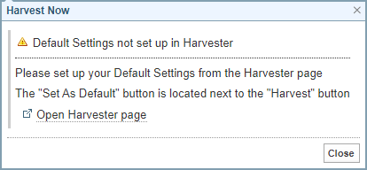 If a default is not set, a message is displayed with a link to open Harvester to set a default.