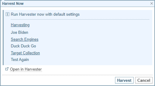 When you select Harvest Now the dialog summarises the Harvester settings.